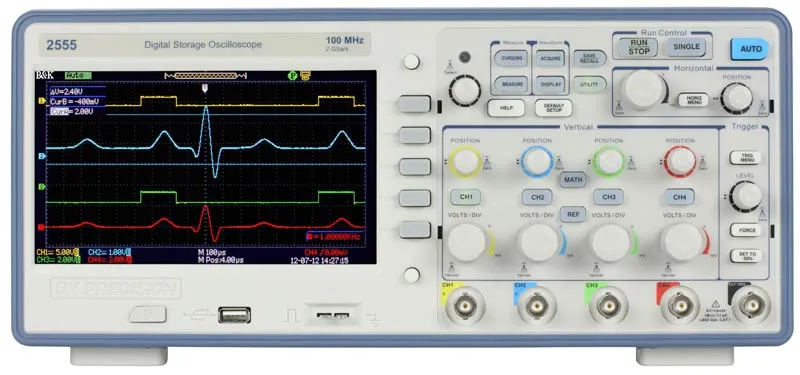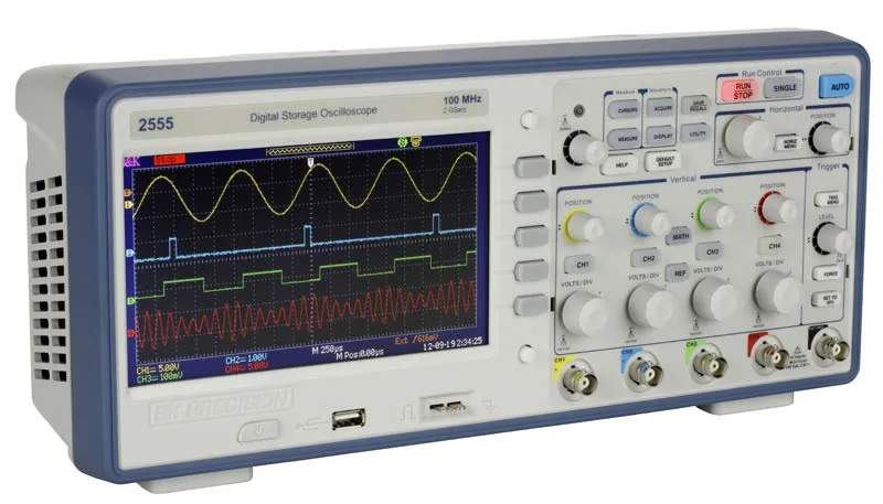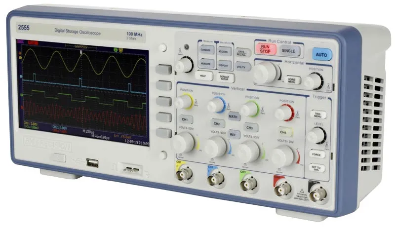 digital Equipo descontinuado: Los osciloscopios de almacenamiento digital de la serie 2550 ofrecen rendimiento y valor en configuraciones de 2 y 4 canales. Con un ancho de banda de 70 MHz a 300 MHz y velocidades de muestreo de 2 GSa/s, estos osciloscopios ofrecen una memoria de forma de onda de 24 kpts/canal, 32 mediciones automáticas y capacidades de disparo avanzadas que incluyen funciones matemáticas. Diseñados para permitirle ver más de su señal bajo prueba, la pantalla ancha TFT de 7” de la serie 2550 ofrece un área de visualización significativamente más grande que los osciloscopios económicos típicos (5,7”).