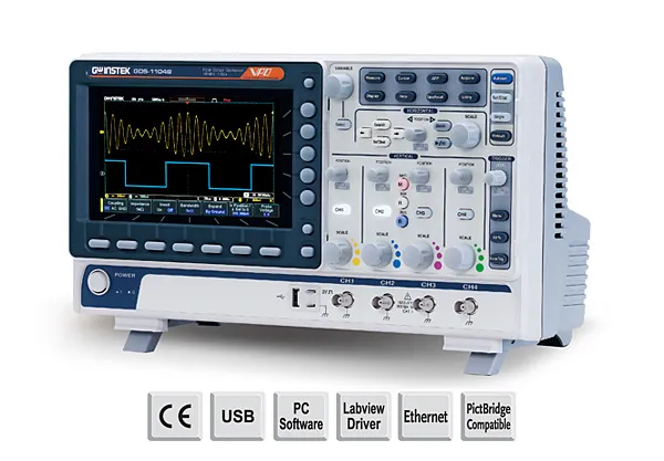 GW Instek La serie GDS-1000B cuenta con cuatro selecciones de ancho de banda: 200 MHz, 100 MHz, 70 MHz, 50 MHz y está equipada con terminales de entrada de señal analógica por cuatro o dos canales. Tiene una velocidad de actualización de forma de onda de 50.000 wfms/s, lo que ayuda a los usuarios a observar con precisión la variación detallada de la forma de onda. Además, la pantalla LCD a color WVGA de 7” y la función de visualización de gradiente de 256 colores. Además, el diseño exterior innovador y el diseño compacto también brindan mucha comodidad a los usuarios. Otra operación multifuncional diversificada y encantadora demuestra el concepto de integración tecnológica completa.