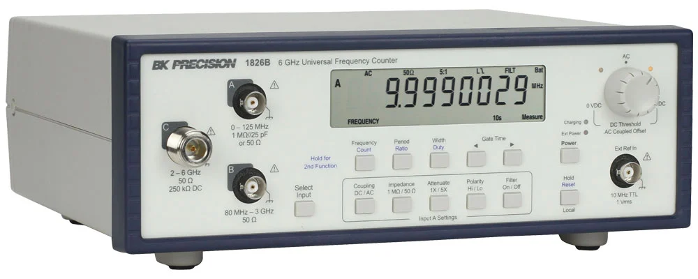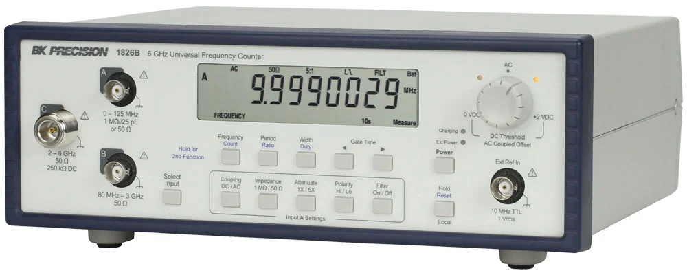 En el frente se incluye una pantalla LCD de 0,5 pulgadas para mostrar mediciones de frecuencia, período, relación, ancho de pulso o conteo de eventos. Los múltiples canales de entrada permiten mediciones precisas en una amplia gama de frecuencias. La entrada A ofrece un acondicionamiento de señal flexible, con acoplamiento configurable (CA o CC), impedancia de entrada (1 MΩ o 50 Ω), atenuación (1:1 o 5:1), umbral (totalmente variable) y borde activo. Con el 1826B, una entrada C adicional ofrece un conector tipo N con impedancia de entrada de 50 Ω y rango de frecuencia de 2 GHz a 6 GHz.
