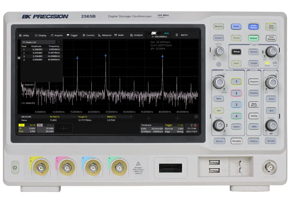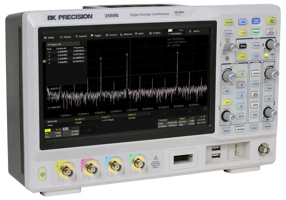 La serie 2560B de osciloscopios de señal mixta (MSO) y almacenamiento digital (DSO) ofrece modelos con ancho de banda de 100 MHz, 200 MHz y 350 MHz en una configuración de 4 canales, con una frecuencia de muestreo de 2 GSa/s y una profundidad de memoria máxima de 200 Mpts. Además, estos osciloscopios están equipados con una gran pantalla táctil capacitiva de 10,1″ que proporciona una resolución de 1024 x 600 y gestos táctiles intuitivos. Esta serie amplía sus capacidades de depuración con nuevas funciones de software que incluyen disparadores de zona, diagramas de Bode y análisis de potencia. El generador de formas de onda arbitrarias de 50 MHz y la decodificación en serie para los protocolos I 2 C, SPI, UART, CAN y LIN son estándar en todos los modelos. Los modelos DSO se pueden actualizar a un MSO, proporcionando 16 canales digitales, en cualquier momento después de la compra. Hay actualizaciones de software adicionales disponibles para la decodificación en serie de los protocolos FlexRay, I 2 S, CAN FD, MIL-STD-1553B, SENT y Manchester.
