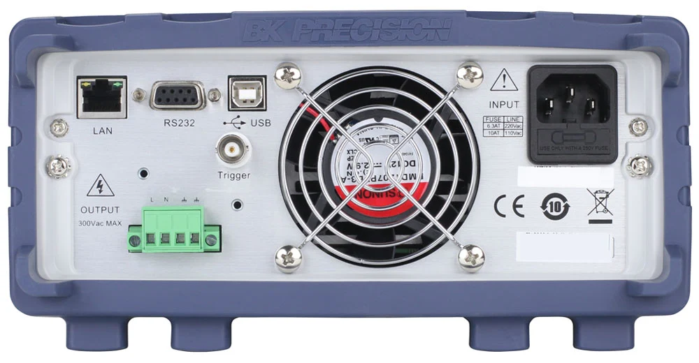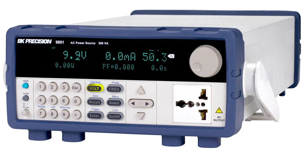 La fuente de poder 9800 es una fuente de AC programable y una herramienta de medición. Estas fuentes de AC lineales totalmente programables proporcionan un máximo de 1500 VA a través de los terminales de salida de línea universal en la parte frontal y el conector de salida en la parte posterior. La salida se puede variar de 0 a 300 V con una resolución de programación de 0,1 V. La frecuencia de salida también se puede ajustar de 45 Hz a 500 Hz con un ángulo de fase de inicio y detención de 0 a 360 grados. La pantalla VFD brillante muestra Vrms, Irms, Ipeak, frecuencia, factor de potencia (PF), potencia aparente, potencia real y tiempo de salida transcurrido.