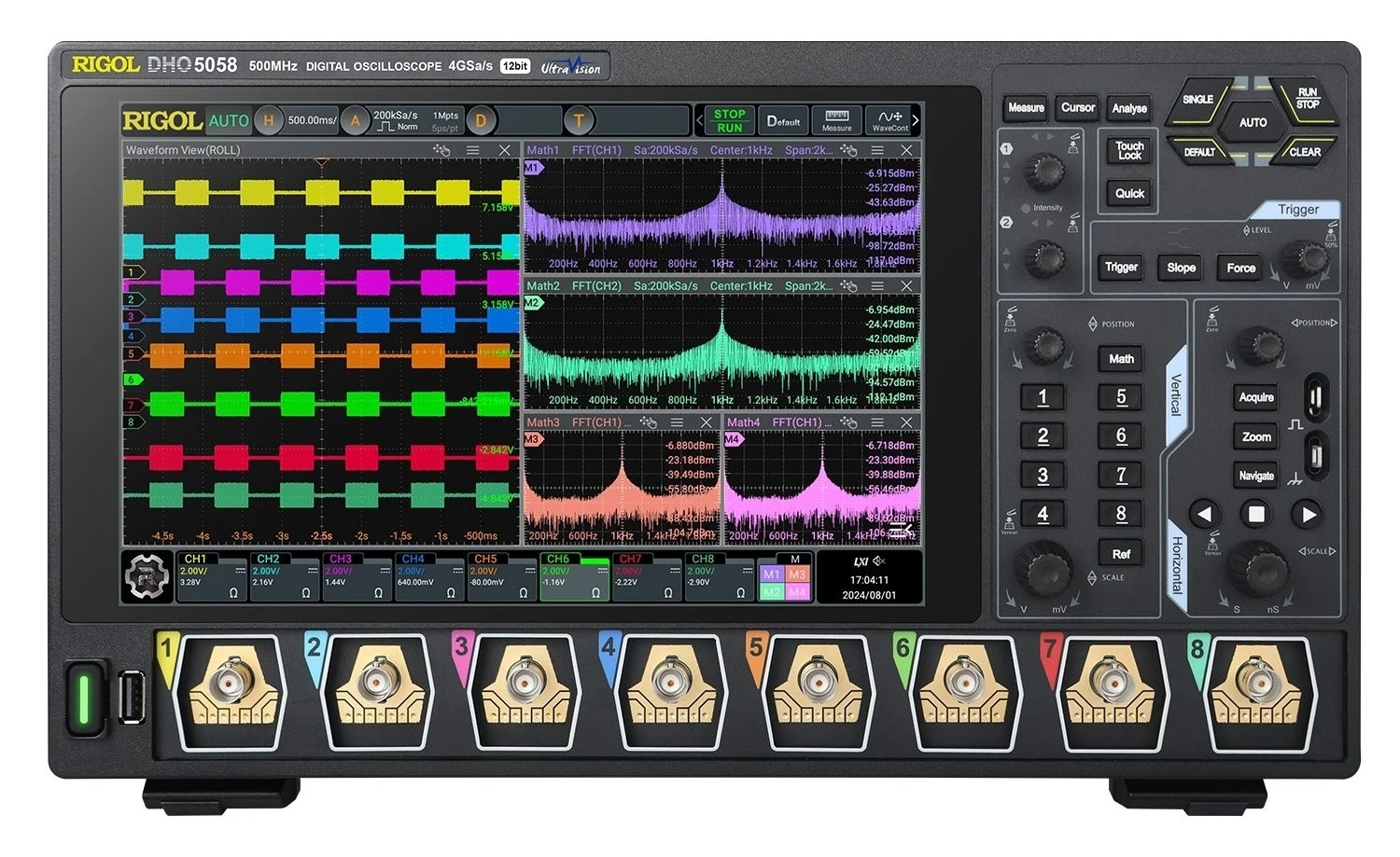 La serie DHO/MHO5000 es una familia de osciloscopios digitales de alta resolución desarrollados para satisfacer los requisitos de diseño, depuración y prueba de una amplia gama de aplicaciones. Su velocidad de captura de forma de onda de 1.000.000 wfms/s (en modo de grabación rápida), su profundidad de memoria de 500 Mpts, su resolución de 12 bits y su excelente nivel de ruido están listos para satisfacer las necesidades de alta precisión de los exigentes escenarios de medición. El osciloscopio digital de la serie DHO/MHO5000 tiene varios modelos, que incluyen configuraciones que admiten la generación de funciones arbitrarias, el análisis de señales digitales, el análisis de diagramas de Bode y otras funciones.