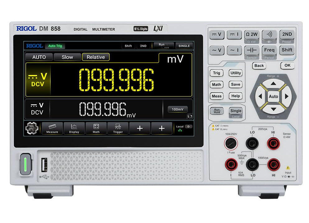 El DM858 es un multímetro digital de sobremesa compacto y potente de 5,5 dígitos con pantalla táctil de 7″. Admite 11 funciones de medición y ofrece una combinación capaz de una velocidad de lectura de 125 lecturas/s con una memoria de registro de 500.000 puntos. El DM858 incluye interfaces USB y LAN para admitir el control remoto. Su tamaño pequeño y peso ligero ahorran espacio en la mesa de trabajo y, al mismo tiempo, permiten su fijación a soportes o bases compatibles con VESA.