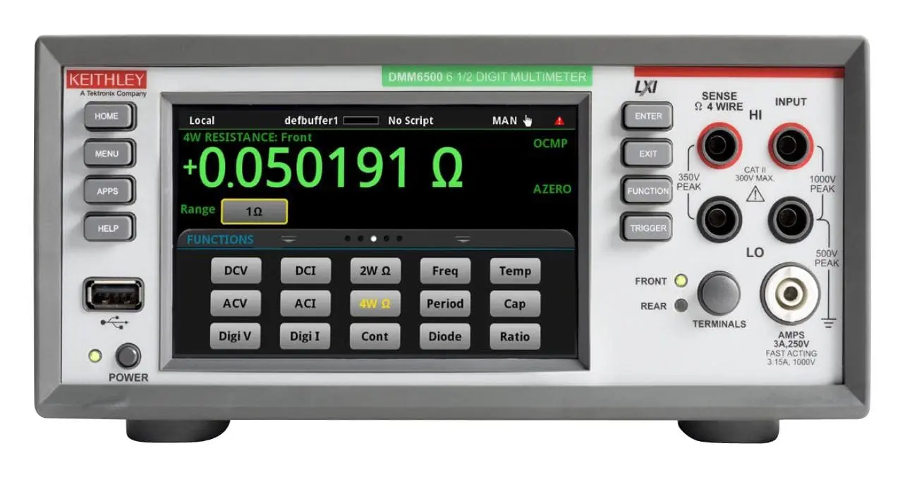 El Keithley DMM6500 es un multímetro digital (DMM) de clase de banco de 6½ dígitos de alto rendimiento que redefine la interacción con el usuario mediante una interfaz gráfica táctil intuitiva. A diferencia de los multímetros tradicionales, cuenta con una pantalla táctil capacitiva de 5 pulgadas que permite visualizar, analizar y explorar mediciones directamente en el equipo. Se utiliza para capturar transitorios de señal, visualizar perfiles de potencia y realizar mediciones de precisión con una velocidad significativamente superior a los multímetros tradicionales. Este equipo es indispensable en laboratorios de Investigación y Desarrollo, entornos de validación de diseño y líneas de manufactura automatizada