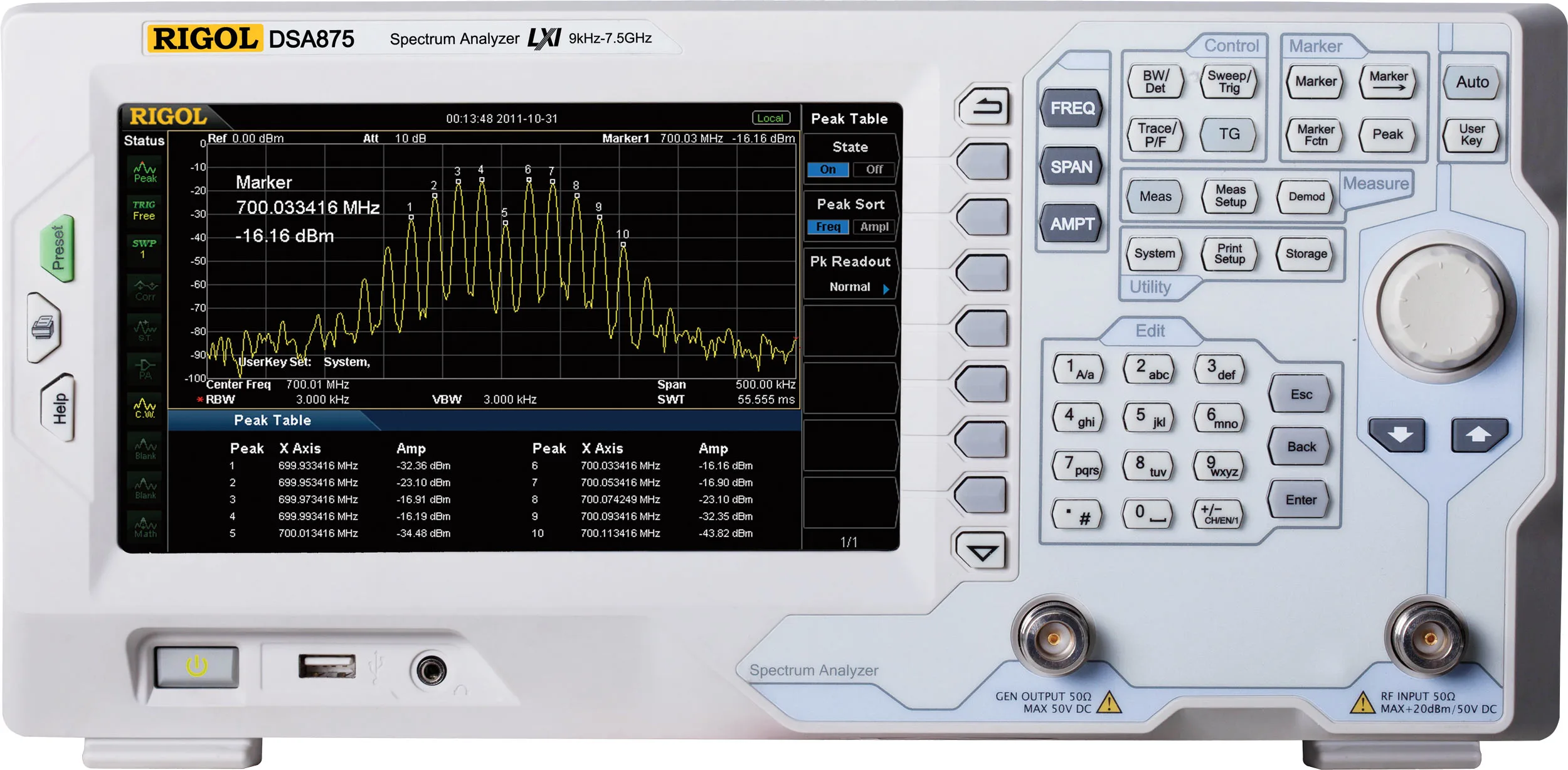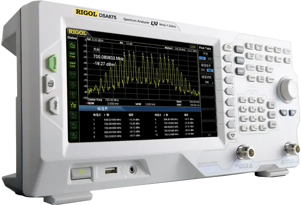 El analizador de espectro ofrece la capacidad de medir señales más pequeñas utilizando nuestro filtro IF digital, que permite configuraciones de ancho de banda más pequeñas y reduce los niveles de ruido mostrados. El DSA815 distingue entre señales con una diferencia de frecuencia de tan solo 10 Hz. El DSA832, DSA832E y DSA875 tienen un DANL (nivel de ruido promedio mostrado) de hasta -161 dBm (típico). Además, Rigol ofrece excelentes opciones que incluyen un filtro EMI y un kit de detector de cuasi-pico, un paquete de medición VSWR y un generador de seguimiento (versión "-TG") para todos estos modelos. Un preamplificador es estándar en todos los modelos de la familia