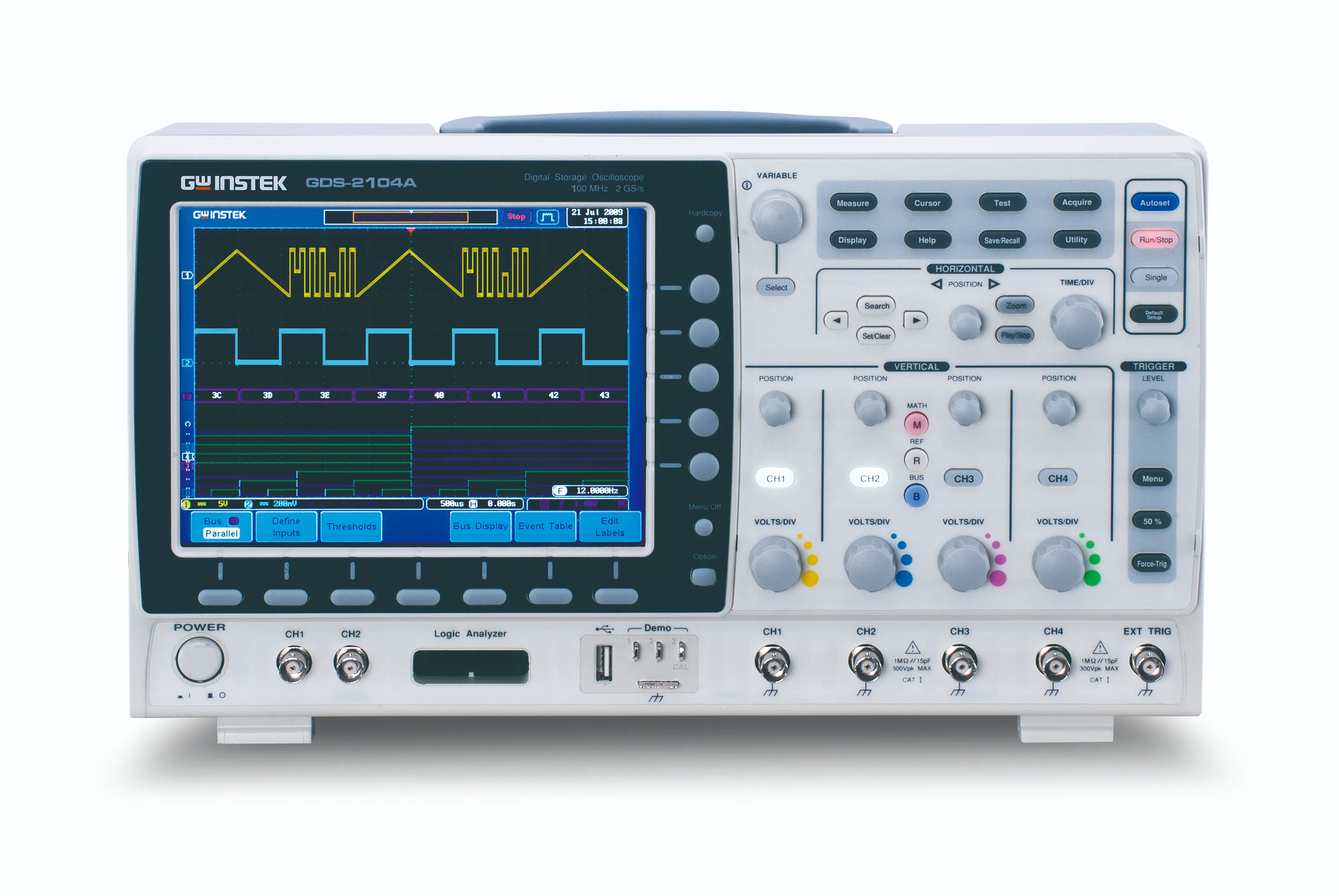 Ofrece configuraciones de 2 y 4 canales y una amplia selección de ancho de banda, que incluye 300 MHz, 200 MHz, 100 MHz y 70 MHz. Cada modelo proporciona una frecuencia de muestreo en tiempo real máxima de 2 GSa/s y una frecuencia de muestreo en tiempo equivalente de alta velocidad de 100 GSa/s. Equipado con una pantalla LCD TFT de 8 pulgadas y 800 x 600 de alta resolución, un rango vertical de 1 mV/div a 10 V/div y una base de tiempo de 1 ns/div a 100 s/div, la serie GDS-2000A puede mostrar fielmente formas de onda de señales complejas y poco claras.