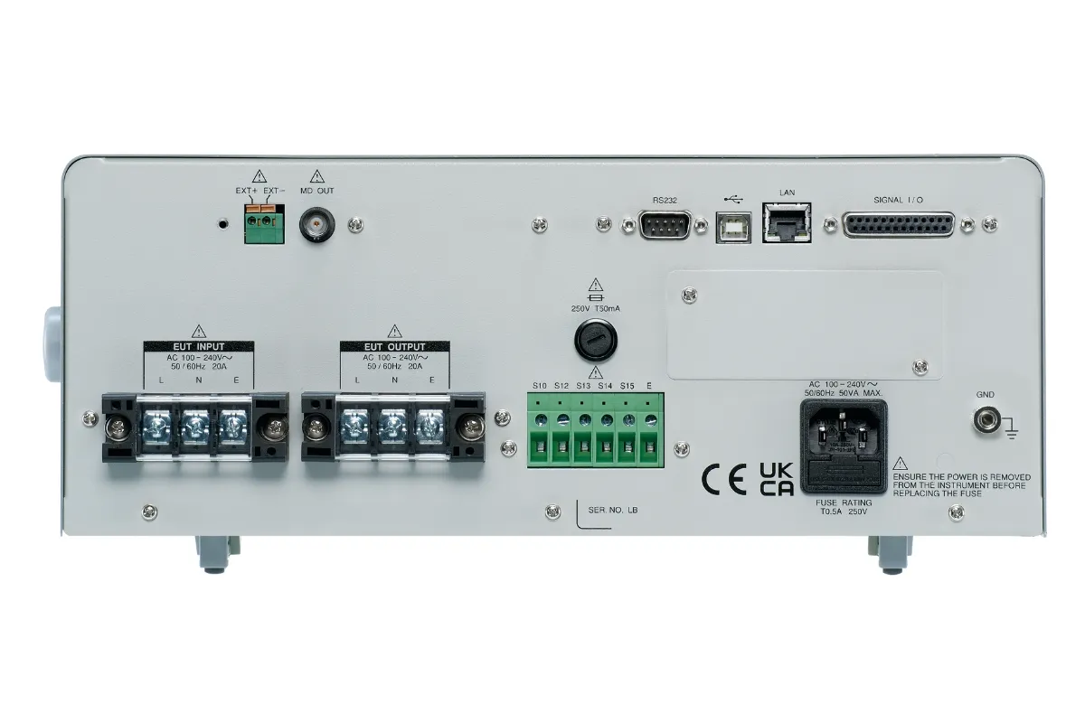 Equipado con una pantalla táctil LCD TFT de 7 pulgadas, facilita la visualización de configuraciones y resultados simultáneamente. Permite medir corriente de fuga a través de salidas frontales (hasta 10 A) o traseras (hasta 20 A), y ofrece almacenamiento para 30 configuraciones de medición y 1000 resultados. Incluye un bloque de terminales externo para redes de impedancia personalizables y soporta interfaces estándar como RS-232C, USB, LAN y opcionalmente GPIB para control y adquisición de datos.