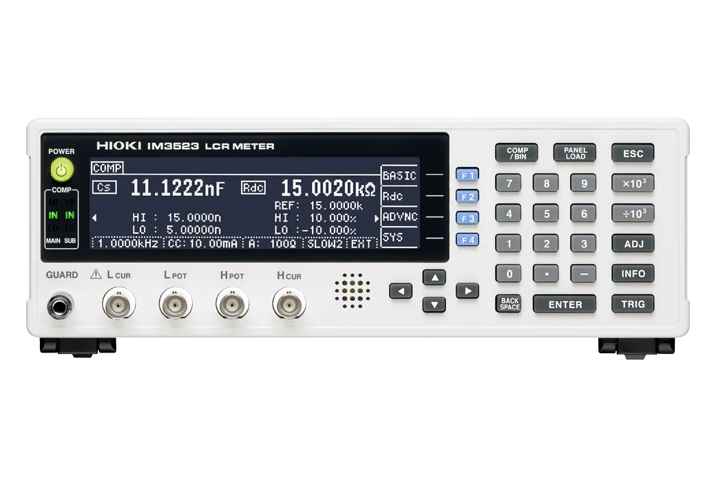 Los medidores LCR y analizadores de impedancia de Hioki van desde dispositivos de 1 mHz a 3 GHz para adaptarse a una amplia gama de aplicaciones en la prueba de componentes electrónicos. El IM3523 está diseñado para mediciones básicas en líneas de producción, por lo que se puede ofrecer a un precio bajo y ofrece una mayor confiabilidad de las mediciones gracias a su función de verificación de contactos.