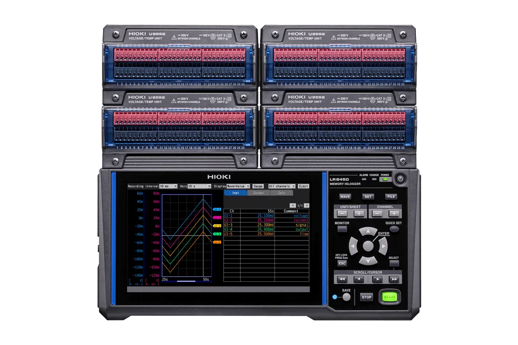 Hioki Memory HiLoggers son registradores de datos de alta velocidad para registrar múltiples canales de señales de voltaje, temperatura, resistencia o humedad; algunos modelos brindan un aislamiento completo entre canales y una fuerte resistencia al ruido. El LR8450 ofrece muestreo de 1 ms en hasta 120 canales y se puede emparejar con 5 tipos diferentes de módulos enchufables. Los módulos miden la tensión y la distorsión, ideales para aplicaciones automotrices que involucran la evaluación de componentes de vehículos, así como equipos robóticos.