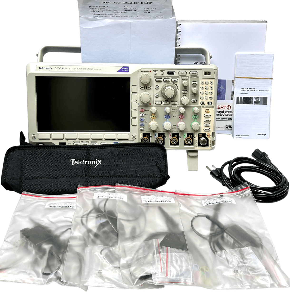 El MDO3014 de 100 MHz es un osciloscopio de dominio mixto que ofrece precisión y funcionalidad avanzada en un solo equipo. Con 4 canales analógicos, velocidad de muestreo de hasta 2.5 GS/s y una longitud de registro de hasta 10 Mpts, permite capturar señales complejas con alta fidelidad. Su pantalla LCD a color brinda una visualización clara y detallada, mientras que las salidas USB, LAN y VIDEO facilitan la conectividad y exportación de datos. Este instrumento 6 en 1 integra funciones de osciloscopio, analizador de espectro, voltímetro, contador digital y, de forma opcional, generador de funciones arbitrarias, analizador lógico de 16 canales y analizador de protocolo, siendo ideal para aplicaciones de diseño, prueba y validación electrónica.