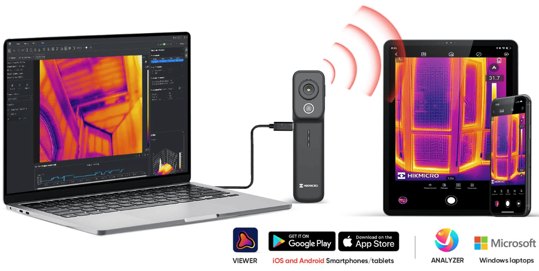 La MiniX de HIKMICRO es una cámara termográfica portátil que se conecta de forma inalámbrica a su dispositivo móvil. Ofrece varios métodos de instalación gracias a sus soportes: fijación al teléfono o tableta para uso con una sola mano, montaje magnético en pared o colocación en trípode para mediciones prolongadas.