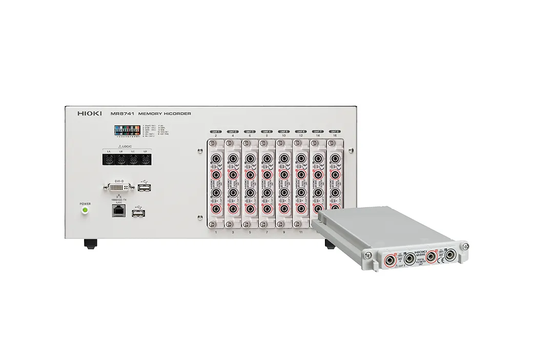 El MR8740 y el MR8741 son sistemas de adquisición de datos que se pueden montar en bastidor y ofrecen mediciones multicanal de alta velocidad en un máximo de 32+22 canales. La unidad DVM MR8990 es una unidad de entrada de 2 canales para el MR8740/MR8741 para medir fluctuaciones mínimas en la salida de sensores en automóviles y otros equipos y fluctuaciones de voltaje en dispositivos como baterías a altos niveles de precisión y resolución.