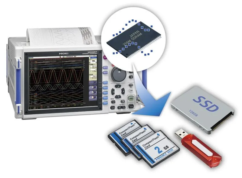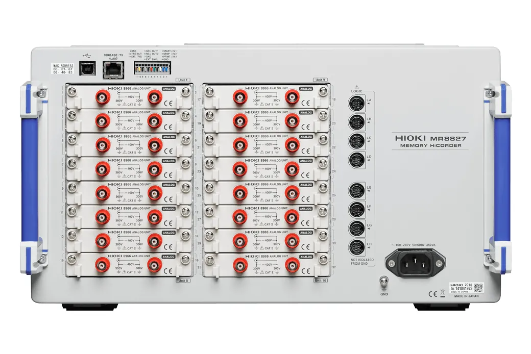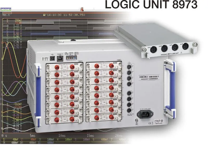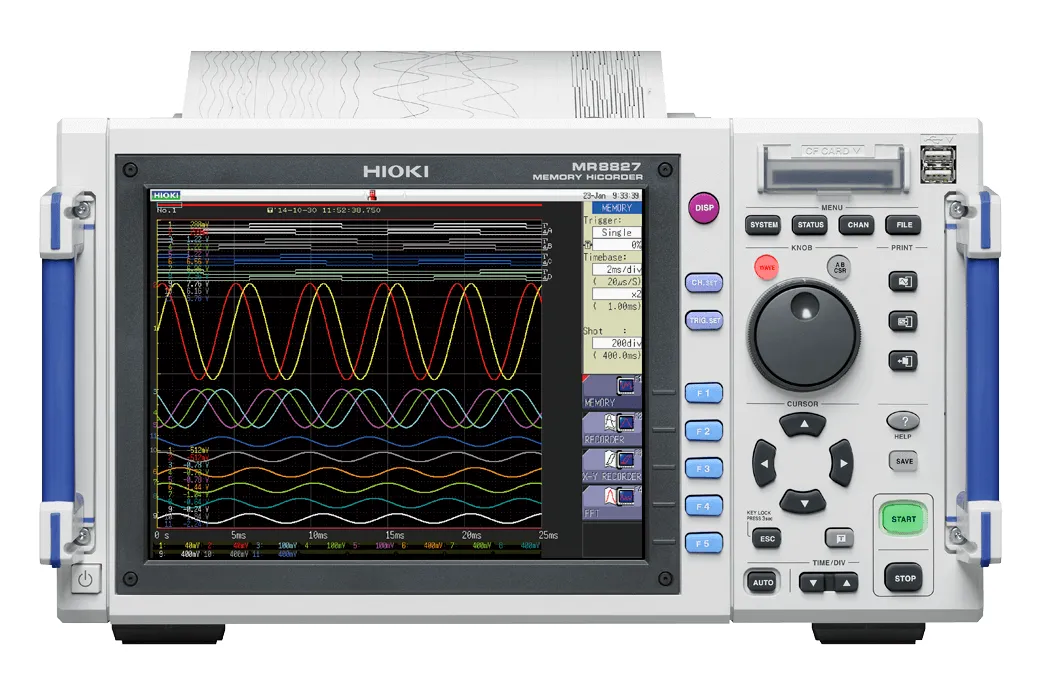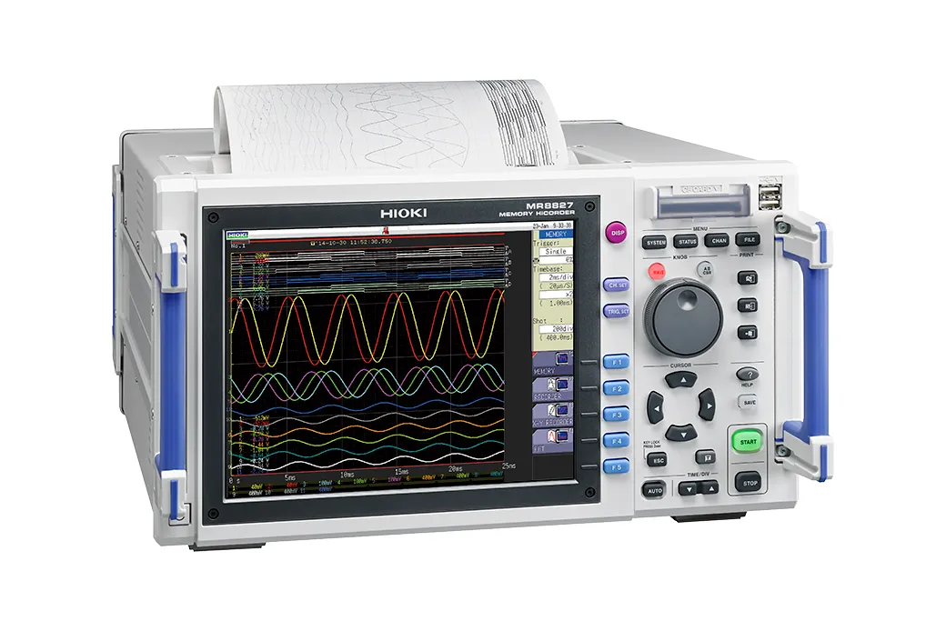 Hioki Memory HiCorders son dispositivos de grabación y monitoreo de forma de onda de alta velocidad que pueden medir simultáneamente múltiples fenómenos físicos como voltaje, corriente, temperatura, vibración, peso, aceleración y rotación debido al aislamiento completo entre canales y de cada canal a tierra. Más que un simple osciloscopio digital, la grabadora de adquisición de datos (DAQ) MR8827 admite módulos de entrada plug-and-play para satisfacer aplicaciones tales como recorridos de prueba después del mantenimiento programado de vagones de ferrocarril para verificar señales de comando de voltaje, corriente del motor, velocidad del vagón, y presión de freno.