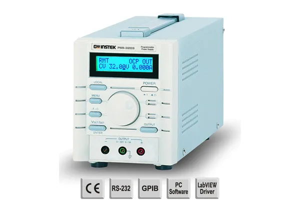 La serie PSS son fuentes de alimentación DC lineales programables de salida única, 96 o 100 W. OVP, OCP y OTP protege la serie PSS y su carga de condiciones inesperadas. El panel LCD simultáneamente muestra la salida y otros parámetros además el ventilador de refrigeración regulado garantiza un bajo nivel de ruido para un funcionamiento cómodo. Las interfaces RS232C y GPIB, los conjuntos de comandos SCPI y los controladores LABVIEW facilitan el desarrollo de software ATE y el control remoto. (Nota: solo se pueden instalar RS-232C o GPIB al mismo tiempo).