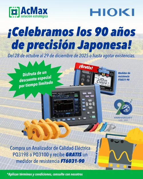 ¡Este año, Hioki celebra 90 años de innovación en medición eléctrica y lo festejamos contigo! Al adquirir un Analizador de Calidad Eléctrica PQ3198 o PQ3100, recibe sin costo adicional un FT6031-90, ¡además de un descuento especial!